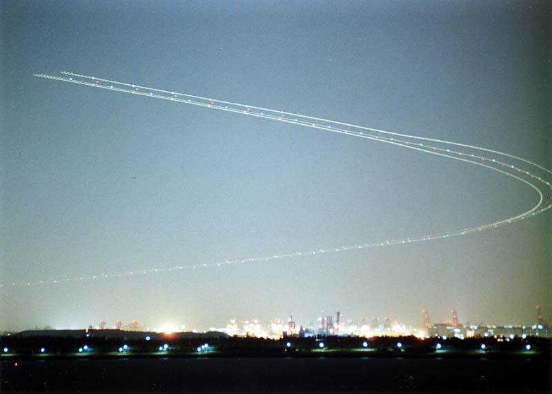 すこーしピント甘いんですけど(^^;浦安にあるホテルのベランダから撮影した羽田空港へ飛行機がアプローチしている所の写真です。雑誌でのコメントには、「船舶の光跡はみたことがあるが、飛行機の光跡は初めてみた」とありました。この写真を撮ろうと思ったのは撮影の2年前。なかなかチャンスがなくって・・・もう一回チャレンジしたい写真です。 | |||